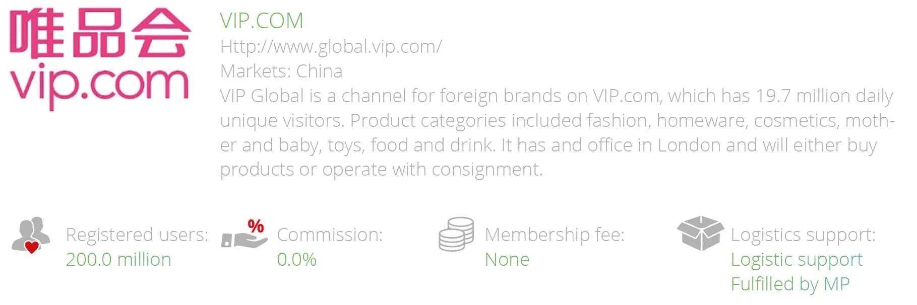 VIP.com is a flash sale website and China’s leading online discount retailer market for brands. VIP.com partners with popular and well-known brands by selling their excess inventory at discount prices. To qualify as a supplier, you need to either be a brand owner or a sole agent of a brand. For updated information, go to http://vis.vip.com/stipulate/